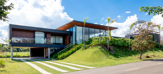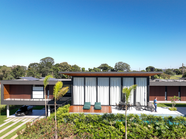 Esta impressionante casa moderna se destaca por seus amplos vãos de vidro, que proporcionam uma iluminação natural abundante e uma vista deslumbrante do exterior. As esquadrias de alumínio, com seu design elegante e durabilidade, são ideais para suportar essas grandes superfícies envidraçadas, garantindo segurança e eficiência.